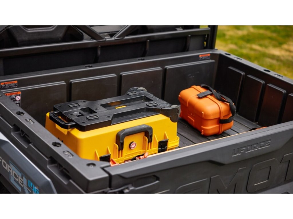 Korba je výklopná, umožňuje nástavbu bočnic nebo jiného příslušenství rychlosystémem CF-Connect
