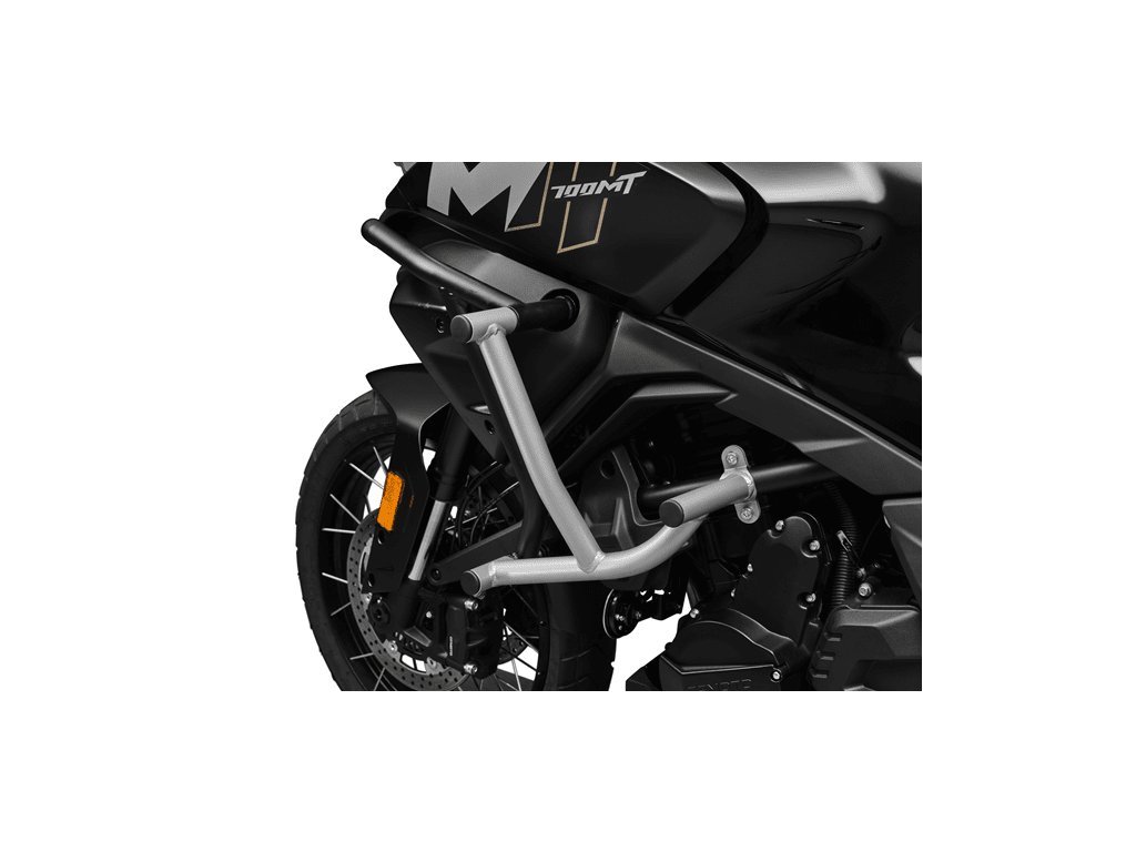 Přídavné rámy z originální řady příslušenství CFMOTO představují ideální rozšíření standardního padacího rámu motocyklu 700MT Adventure. Jsou navrženy tak, aby poskytovaly zvýšenou ochranu nejen samotnému stroji, ale také jezdci – a to především v situacích, jako je náročné manévrování v terénu nebo pád.